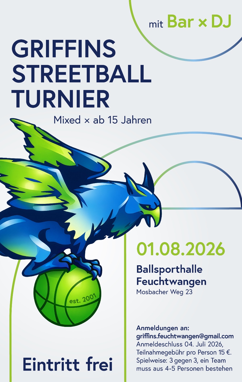 Am 01.08.2026 veranstalten die Griffins Feuchtwangen anlässlich des 25-jährigen Abteilungsjubiläums ein Streeballturnier(3x3) in der Ballsporthalle.