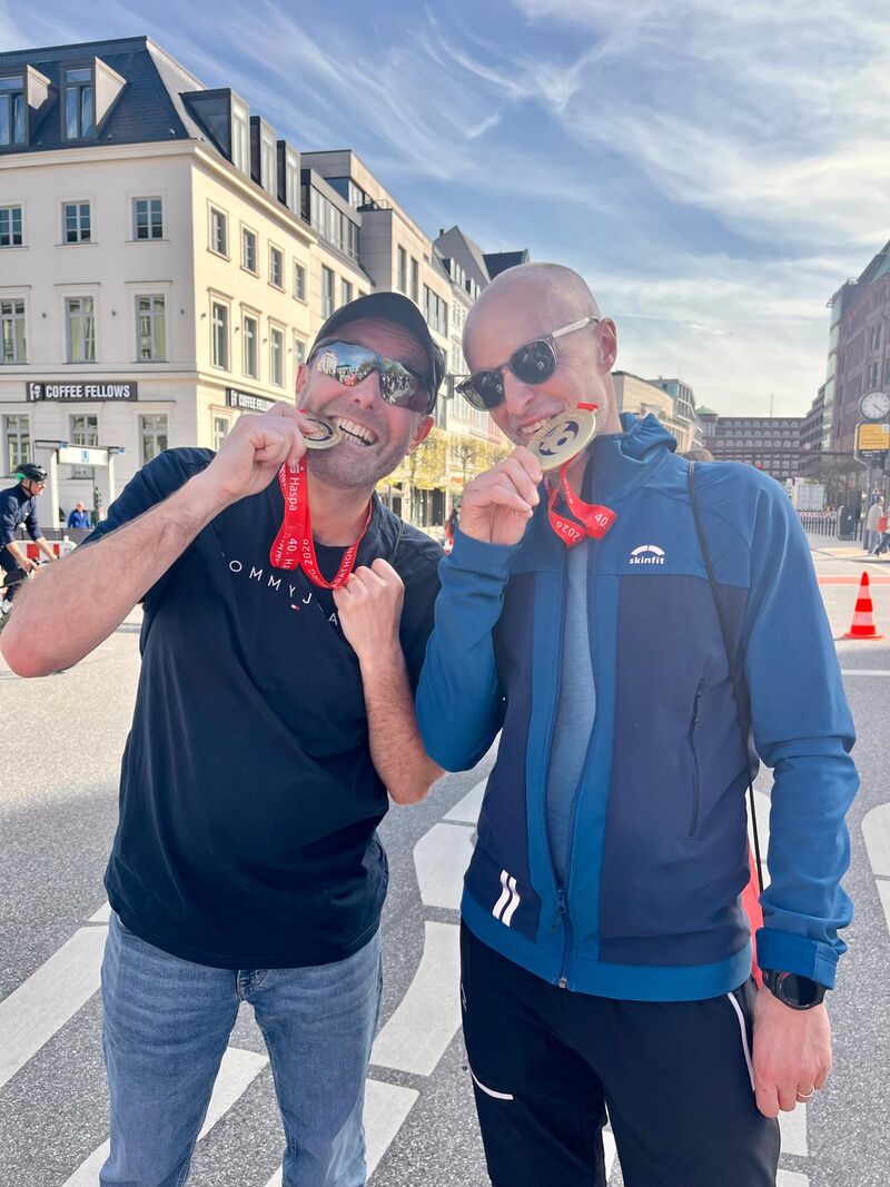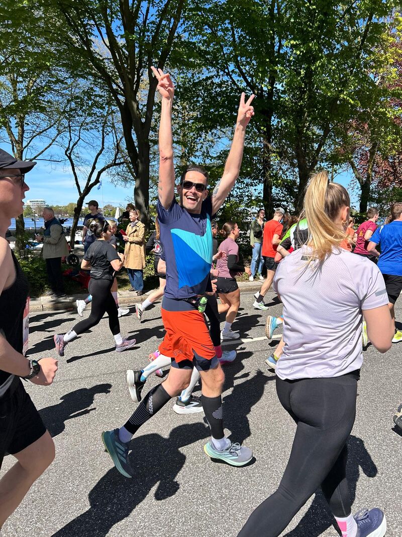Thomas Schmidt hatte mit dem Hamburg-Marathon aus dem vergangenen Jahr „noch eine Rechnung offen“ – damals finishte er ganz knapp über der 4-Stunden-Marke. Dieses Jahr dann die Punktlandung: 03:59:30 😉 … genau 2 Stunden langsamer als der am gleichen Tag gelaufenen Weltrekord (beim London-Marathon).
